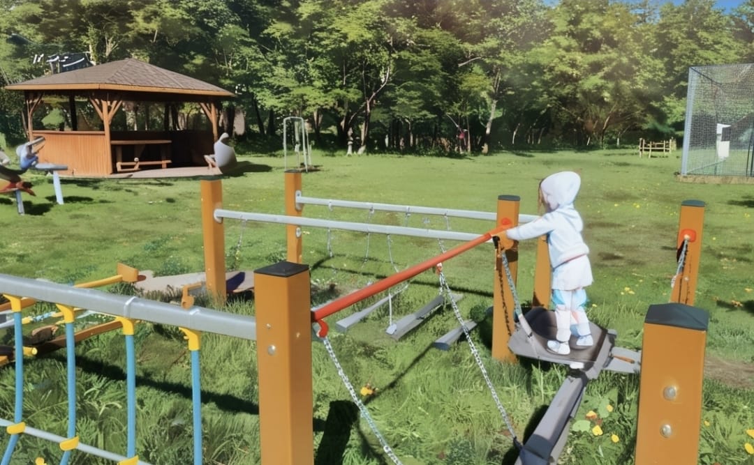 Potom uviděla lanovou překážku, která vypadala jako malý most. Jonki zbožovala lézt! Tatínek ji povzbuzoval. Opatrně našlapovala po dřevěných prknech a držela se provazových sítí po stranách. Byla to výzva, ale Jonki se nevzdávala a s trochou námahy se dostala na druhou stranu. "Hurá!" zavýskla a s tatínkem si plácli.
